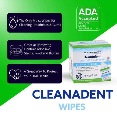 Dr. B Dental Solutions Cleanadent Wipes - Convenient Denture Cleaning Wipes, Refreshes Gums, No Artificial Colors/Flavors - 30 Count