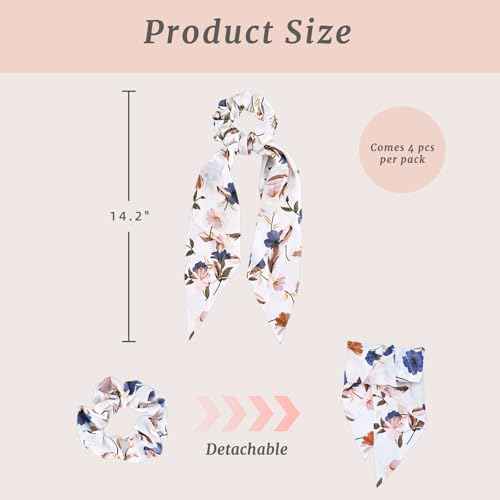4-Piece Satin Hair Scarf Scrunchies for Women Girls, No Damage Cute Hair Ties with Bow Ribbons Ponytail Holders Elastic Rubber Bands (White Flower)