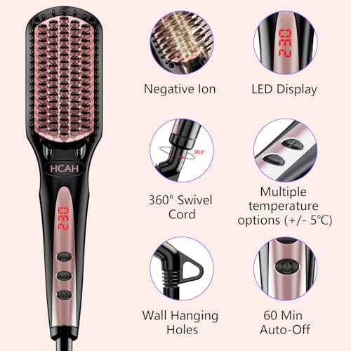 Hair Straightener Brush for Women, Negative Ion Ceramic Hair Straightening Brush with Anti-Scald Protection, Dual 110-240V Worldwide Voltage Suit for Travel, 60 min Auto-Off, Glove Include