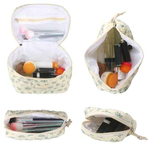 VIWIME Makeup Cosmetic Bag, Large Cotton Quilted Travel Coquette Aesthetic Cute Floral Make up Bag for Women Toiletry Bag Organizer (203- Blue Rose / 4Pcs)
