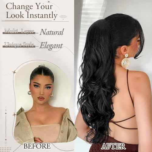 AISI BEAUTY Ponytail Extension 26 Inch Drawstring Ponytail Extension for Women Synthetic Long Black Wavy Layered Pony Tails Hair Extensions Clip in hairpieces fow Women