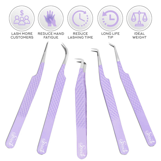 SIVOTE Lash Tweezers for Eyelash Extensions, Pack of 5 Purple – Lash Extension Tweezers Set with Diamond Grip, Precision Fiber Tip for Volume Eyelash Extensions