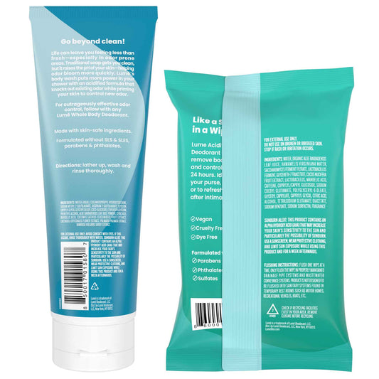 Lume Acidified Body Wash & Flushable Deodorant Wipes - 24 Hour Odor Control - Hydrating Wash - Without SLS or Parabens - OB/GYN Developed - 8.5 Ounce (Unscented) 15 Count Wipes (Cool Cucumber)