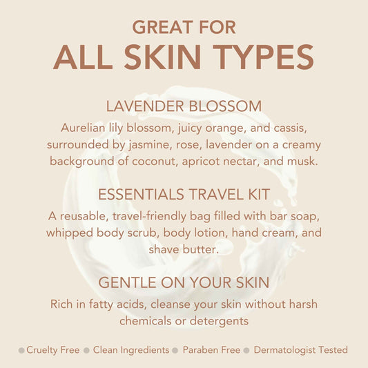 Dionis Goat Milk Skincare Lavender Blossom 6 Pc Self Care Essentials Travel Set - Bar Soap, Shave Butter, Hand Cream, Body Lotion & Whipped Sugar Body Scrub In Resealable Leak Resistant Carrying Case