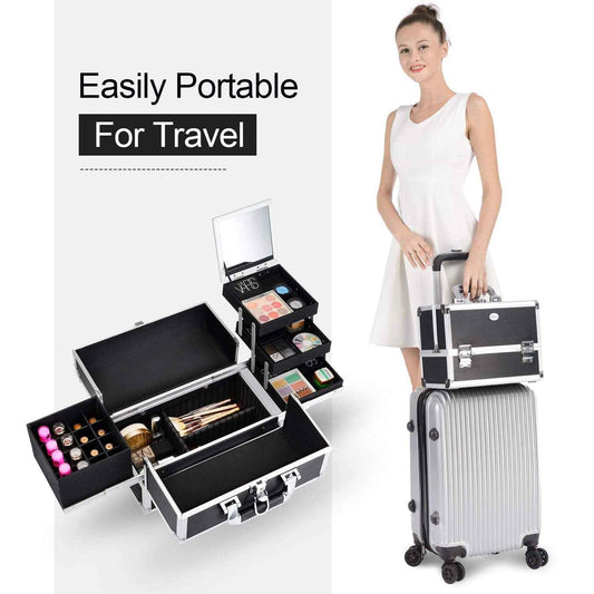 Joligrace Makeup Train Case Organizer Box Professional Multi-Purpose Cosmetic Storage with Sliding Trays, Polish Slots & Mirror, Portable Lockable with Keys, Large Black