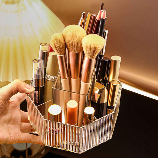 LINFIDITE 360°Rotating Makeup Brush Holder Cosmetic Display Case Clear Makeup Lip Gloss Organizer Case with 5 Slots Round Turntable Storage Tray for Vanity, Bathroom, Counter Organizer Clear Pink