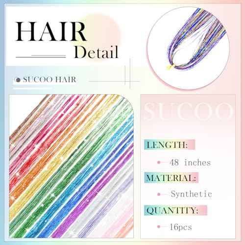 Hair Tinsel Kit (16 Colors, 4800 Strands, 48 Inches) Metallic Colored Sparking Tinsel Hair Extensions Kit with Tools Heat Resistant Highlights Glitter for Girls Women