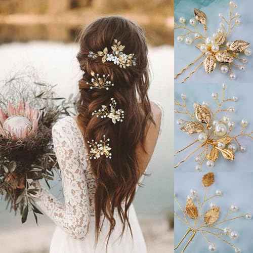 4 PCS Bridal Hair Pins Gold Leaf Crystal Floral Pearl Headpiece Vintage Flower Wedding Hair Accessories for Brides Bridesmaids Women Girls