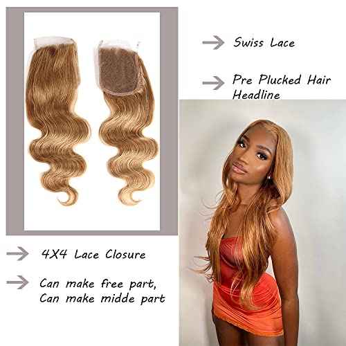 X-TRESS 4X4 Honey Blonde Closure Human Hair Pre Plucked With Baby Hair 4X4 Transparent Lace Free Part Bleached Konts 16 Inch Malaysian Natural Hair Human Hair Body Wave Honey Blonde Lace Closure