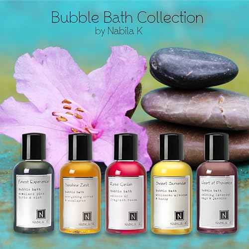 Assorted Travel Size Bubble Bath Collection (Set of 5) by Nabila K - Forest Experience, Sunshine Zest, Rose Garden, Sweet Surrender, Heart of Provence - Essential Oils with Natural Ingredients - 2 oz
