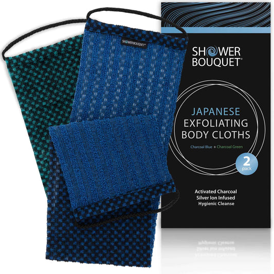 Japanese Exfoliating Washcloth for Back & Body 2-Pack - Charcoal & Silver Ion Exfoliating Towel with Handles - Two-Sided Gentle Exfoliation & Deep Cleanse Body Wash Cloths for Shower - 1 Blue, 1 Green