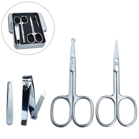 5Pcs Beauty Grooming Eyebrow Scissor Men Women Facial Nose Hair Scissor Curved Round Blunt Mustache Beard Manicure Pedicure Trimmer Set Stainless Steel Slant Tweezers Nail Clipper Pet Dog Scissor Kit