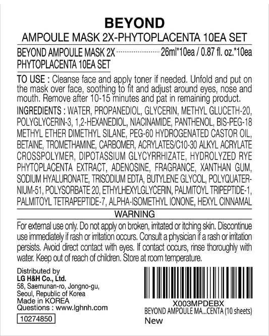 BEYOND Intensive Ampoule Mask 2X Phytoplacenta (25ml/0.85fl oz * 10 sheets) - Dermatologically Tested Hypoallergenic Sheet Masks for Improved Skin Elasticity