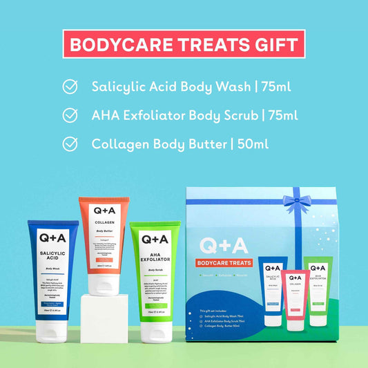 Q+A Bodycare Treats Gift Set, 3-Step Routine for Smooth, Soft Skin, Salicylic Acid Body Wash (75ml), AHA Body Scrub (75ml) & Collagen Body Butter (50ml), Stocking Stuffers and Travel Size Toiletries