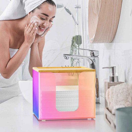 VITVITI Disposable Face Towel Holder Box, Acrylic Facial Towel Container for XL Clean Skin Club, Large Disposable Face Towels Storage with Bamboo Lid, for Bathroom, Vanity Makeup, Rainbow