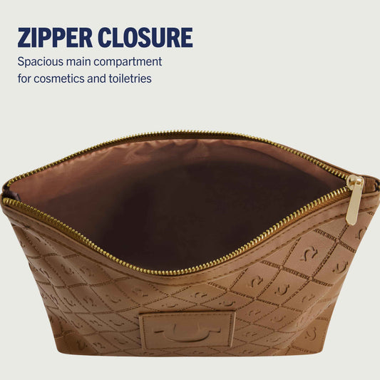 True Religion Women's Makeup Bag, Small Travel Cosmetic Zipper Pouch Organizer, Gold Hardware, Brown