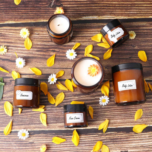 3 Pack 2 oz Amber Glass Jars with lids, Cosmetic Jars with Inner Liners and Black Lids, Lotion Jars, Candle Making Jars for Lotions, Scrubs and Cosmetic, Lables and Spatulas Include