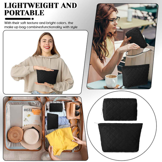 Huhumy 2 Pcs Pencil Case Quilted Makeup Bag Aesthetic Cosmetic Pouch for Women Puffer Travel Toiletry Bag Set Cotton Small Purse Pouch Makeup Organizer with Zipper(Black)