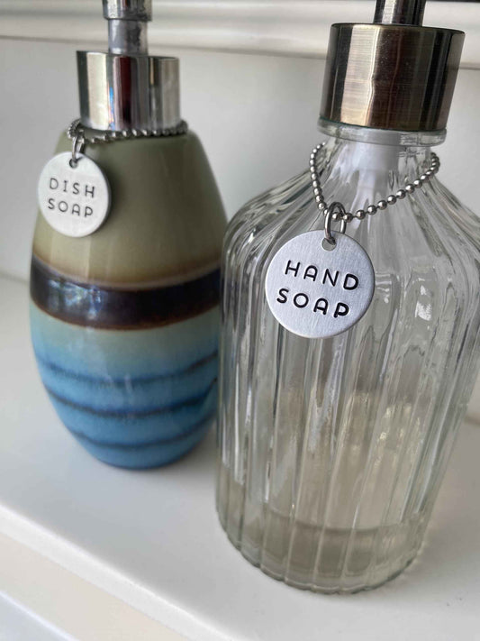 3 Piece Soap Dispenser Labels - Hand, Dish & Lotion Bottle Tag Set - Hand-Stamped Brass or Aluminum, Silver/Gold Color - Guest Bathroom & Kitchen Organization (Aluminum (Silver))