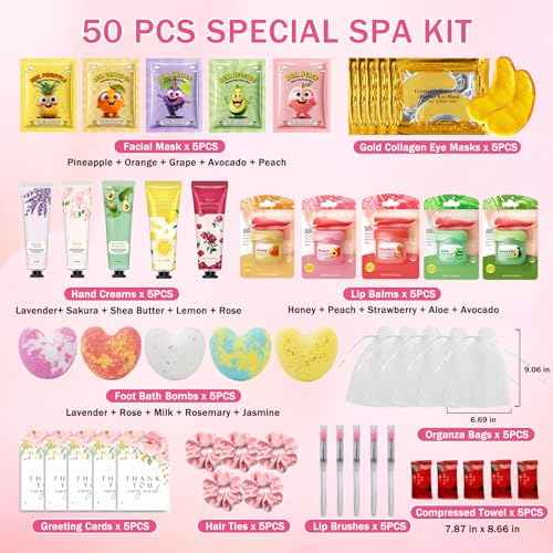 50 PCS Spa Party Supplies for Girls & Women, Facial Masks- Hand Cream- Lip Balm- Bath Bomb- Eye Mask- Compressed Towel- Hair Ties- Lip Brush- Organza Bags, Spa Kit for Birthday, Sleepover, Spa Day