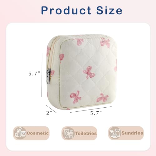 Small Quilted Cosmetic Pouch for Purse, Mini Cotton Makeup Bag with Compartments, Cute Zipper Lipstick Holder for Women (03White Bow)