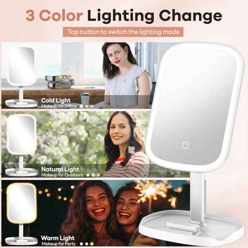 Makeup Mirror with Lights, Rechargeable Vanity Mirror with 3 Color Light, Adjustable Brightness, 360¡Æ Degree Rotation, Makeup Mirror for Beginners, Gifts for Women (White)