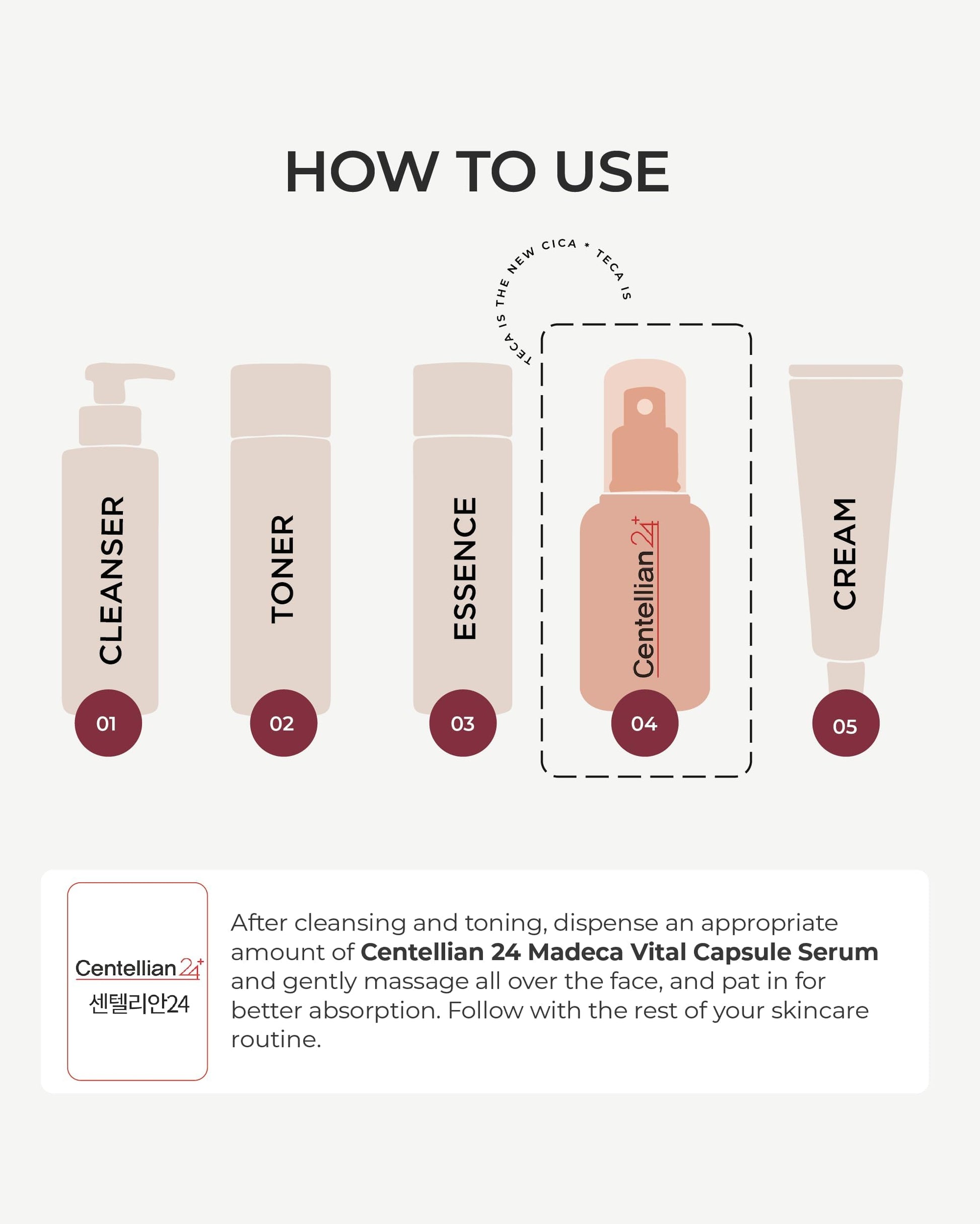 - TOTAL SKINCARE SOLUTION - The key ingredients found in Centellian 24 Vital Capsule Serum - TECA (titrated extract of centella asiatica), centella asiatica, astaxanthin, vitamin C (ascorbic acid), and hydrolyzed collagen - work their way deep into the skin to help soothe and moisturize, while it also promotes improved skin elasticity/protection.