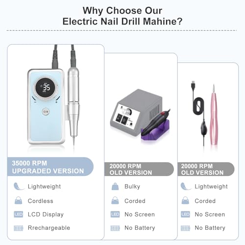 Rechargeable Nail Drill Macine, 35000RPM Professional Electric Efile Nail Drill with LCD Display for Acrylic Nails Remove, Portable Manicure Pedicure Polishing Tools with everything for Salon Home Use