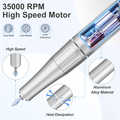 - ¡¼Secure & Portable Nail Efile¡½The Quality aluminum alloy handpiece is made up of powerful yet quiet torque with smart heat dissipation and low vibration, makes it works more safe, smoother and more quietly even at a high speed(0-35000 RPM). Small size and light weight drill pen design, it will not let your hand be numb even after long-term use.