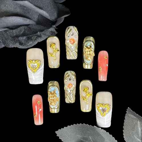 Handmade Press On Nails Square Little Angel Design - Luxury Gold Vintage False Nails with 3D Floral Hearts, Reusable Acrylic Nail Tips for Bridal/Birthday Gift (Gold angel, L)