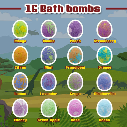 Bath Bombs for Kids with Surprise Inside, 16 Pack Kids Bath Bombs Gift Set for Easter Basket Stuffers, Dino Egg Bath Bomb Kit with 5pcs Dinosaur Bath Toy for Boys Girls Birthday,Christmas