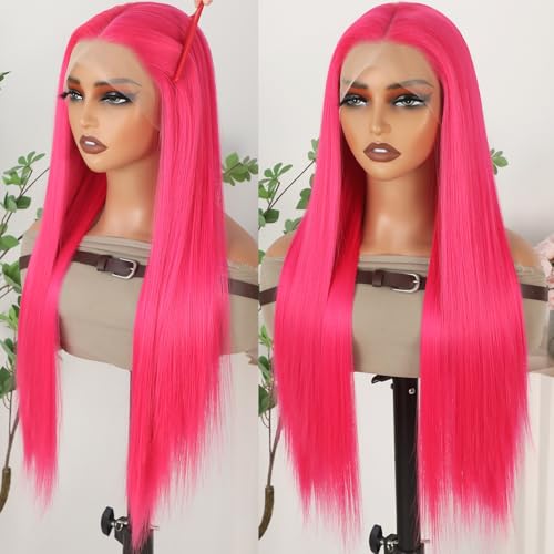 Hot Pink Lace Front Wigs Wear and Go Glueless Wig Pre Plucked Long Straight Hair Wig Magenta Pink Wigs Ready to Wear Wigs Heat Resistant Synthetic Lace Front Wigs for Women