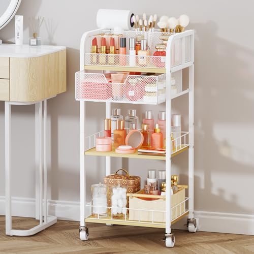 HapiRm Makeup Organizer Storage Cart - 4 Tier Skincare Make Up Storage with Drawer, Rolling Makeup Cart Vanity Organizer Cosmetics Display Cases Holder for Skin Care Perfume Nail Polish Brush