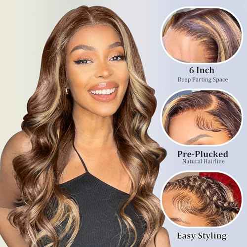 4/27 Honey Blonde Wig Human Hair 13x6 Ombre Lace Front Wigs Human Hair 22 Inch Long, Body Wave Balayage HD Lace Frontal Wig 13x6 Skunk Stripe Human Hair Wigs, 12A 100% Real Brazilian Wigs 180 Density