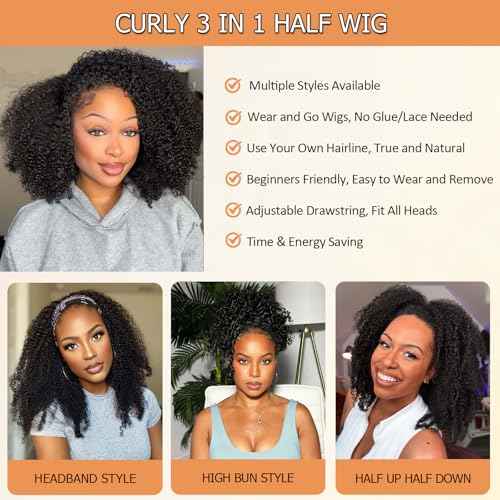 Half Wig Curly Human Hair 200 Density Upgrade 3 IN 1 Half Wigfor Black Women Kinky Curly Beginner Friendly Drawstring Seamless Flip Headband Wig 24 Inch