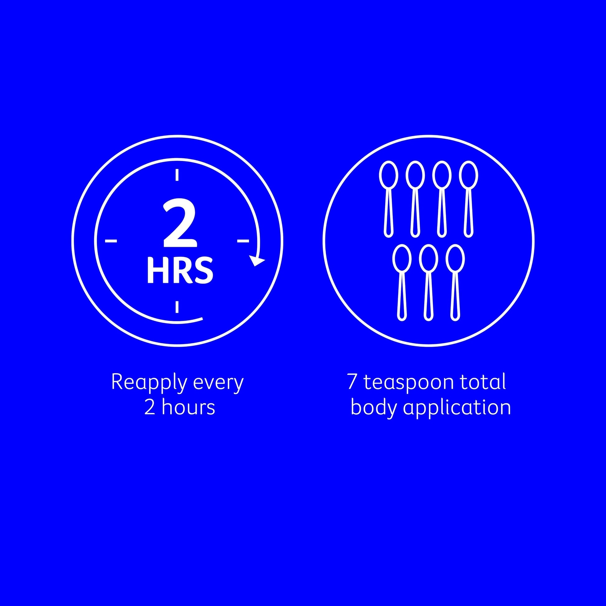 - HOW TO APPLY: Apply generously to clean, dry skin 20 minutes before sun exposure. Use approximately 1 teaspoon per body part (arms, legs, face, torso) for full coverage. Reapply every 2 hours or after swimming, sweating, or towel drying.