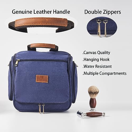 Canvas Toiletry Bag for Men Shaving Dopp Kit Bulk Travel Hanging Makeup Organizer with Sturdy Metal Hook Portable Cosmetic Bag for Women with Large Capacity Blue