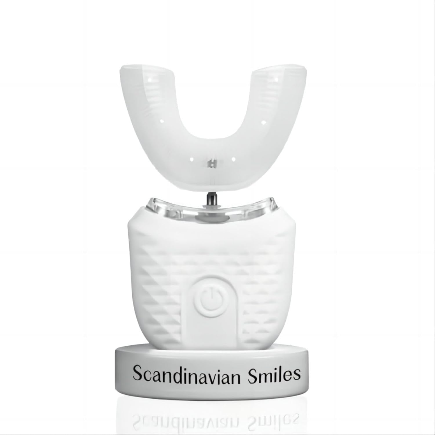 - đ ă360° Full-Coverage Cleaningă The Scandinavian Smiles Toothbrush Adult version offers a patented U-shaped silicone brush head that wraps seamlessly around teeth, cleaning front and back surfaces simultaneously. IPX7 waterproof and ergonomic grip enable safe, hands-free cleaning in only 30 seconds.