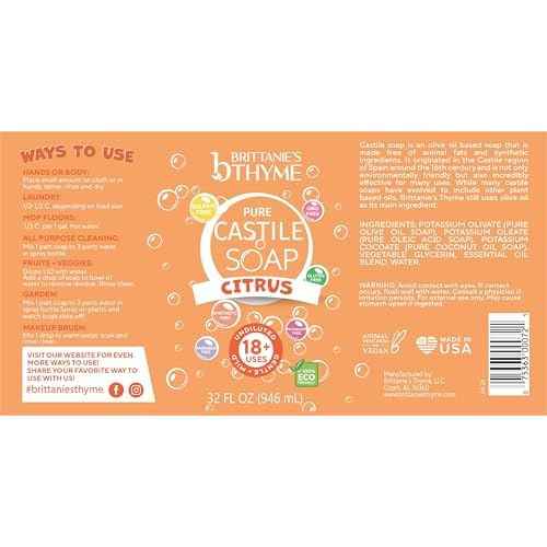Brittanie's Pure Castile Liquid Soap Citrus ? 2 Pack (32oz Each) | Natural, Organic, Multi-Purpose Soap for Body, Face, Home & Pets | Vegan, Sulfate-Free, Made in USA