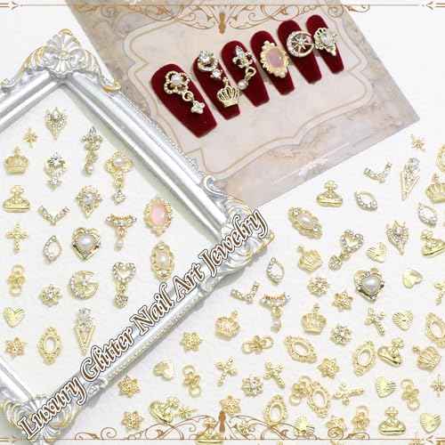 RODAKY 116PCS Gold Nail Charms Luxury Nail Art Jewelry Dangle Heart Nail Gems Pearls Multi Style Nail Diamonds Vintage Nail Decoration for Women Manicure Design