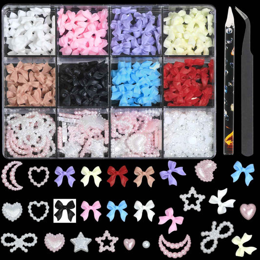 3D Nail Charms and Flatback Pearls Set, 8 Colors Nail Bows+Pink&White Star Heart Moon Cute Nail Jewels+White Nail Pearls for Nail Art DIY Decoration with Pick Up Tweezers and Nail Rhinestone Picker