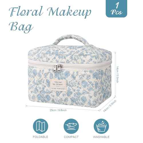 Large Makeup Bag, Cute Cosmetic Bag for Women Girls Floral Coquette Aesthetic Toiletry Bag Travel Make Up Organizer Bag (Blue)