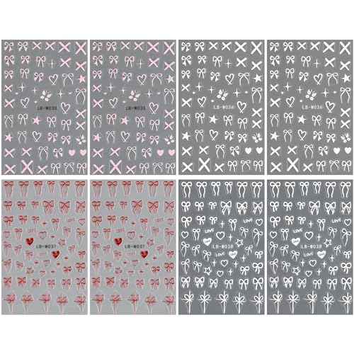 JMEOWIO 8 Sheets Heart Bow Tie Nail Art Stickers Decals Self-Adhesive Pegatinas U?as Pink Nail Supplies Nail Art Design Decoration Accessories
