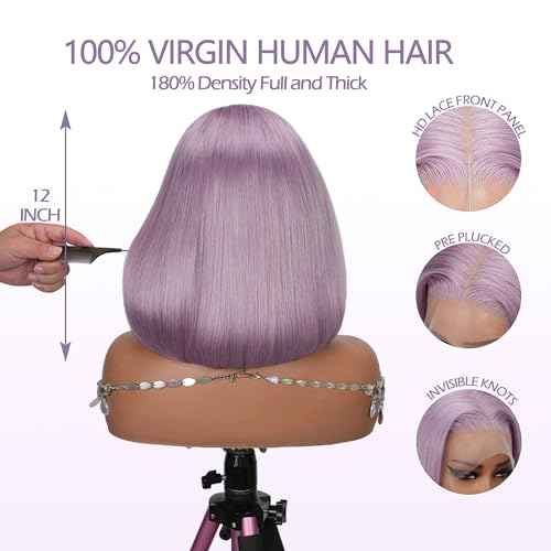 Lilac Bob Lace Front Wigs Human Hair 10 Inch Colored Bob Wig Human Hair 13x4 Frontal Lace Wig Pre Plucked with Baby Hairs 180% Density Glueless Straight Light Purple Short Bob Wig