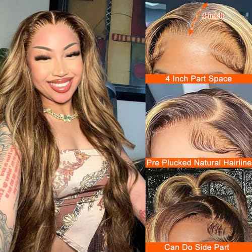 13x4 HD Body Wave Highlight Ombre Lace Front Wig Human Hair Pre Plucked 4/27 Honey Blonde Lace Frontal Wig For Women with Baby Hair 200% Density Glueless Body Wave Colored Lace Front Wig 18 Inch