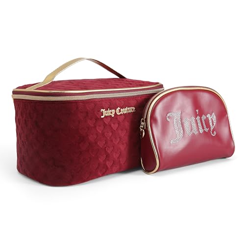 Juicy Couture Red Makeup Bag Cosmetics Organizer Travel Essentials Train Case Coin Purse Velour Heart Faux Leather Rhinestone
