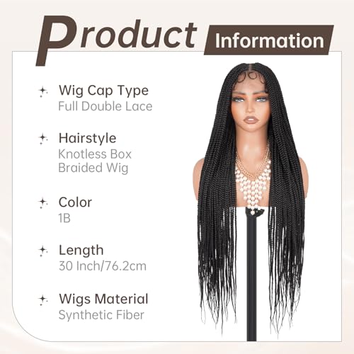 Box Braided Wig Full Double Lace Glueless Braids Wig with Baby Hair Human Hair Blended Synthetic Black Braided Wig for Black Women (1B, 30 Inch)