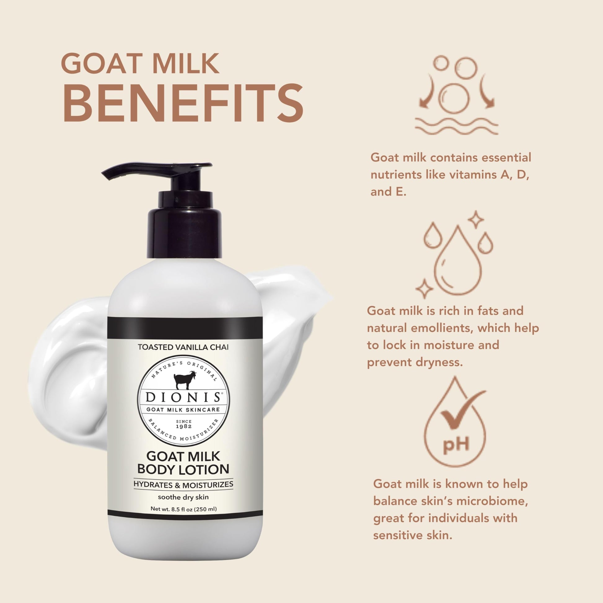 - Skin's Best Friend - The Dionis Goat Milk Skincare Lotion is rich and creamy. With regular use it’s designed to ease rough skin, making it smooth and silky. It also does not leave a greasy residue like many lotions, so you can apply it right before putting on your favorite sweater.