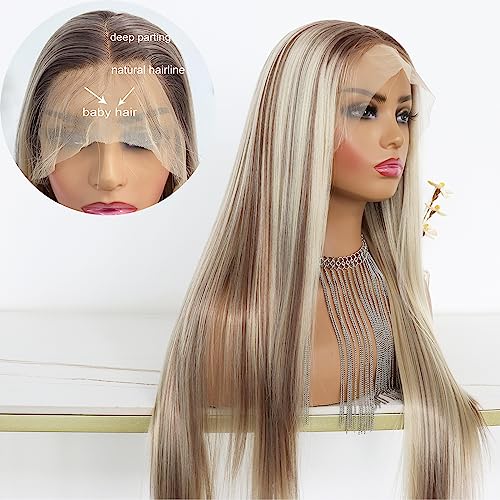 Highlight Ash Blonde Lace Front Wig Long Straight Glueless Ombre Brown Mixed Blonde 13x4 Synthetic Lace Front Wigs for Women 150 Density 24 Inches