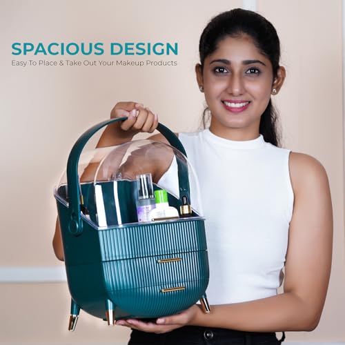 Makeup Cosmetic Organizer Box with Drawer Storage - Plastic Oval Storage Organizer with Turn Lock, Large Capacity for Women¡¯s Skincare and Beauty Products (Green)